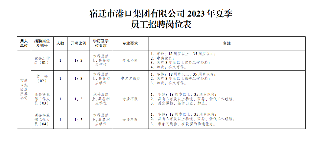 本次面向社会公开招聘工作人员共4人,具体岗位详见《宿迁市港口开云手机·官方站官网有限公司2023年夏季员工招聘岗位表》(见附件,以下简称《岗位表》)。